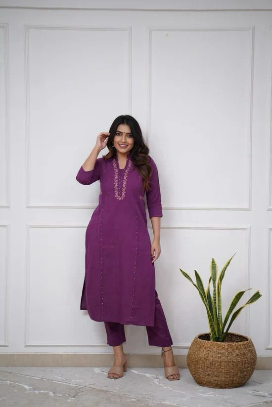 Elevate your ethnic style with this Wine Embroidered Indian Cotton Salwar Kameez Set. The straight-cut kurti features elegant embroidery, paired with matching pants for a chic co-ord look. Crafted from breathable cotton, it ensures all-day comfort while exuding timeless charm. Perfect for festive events, casual outings, or office wear, this stylish set adds grace to any wardrobe.